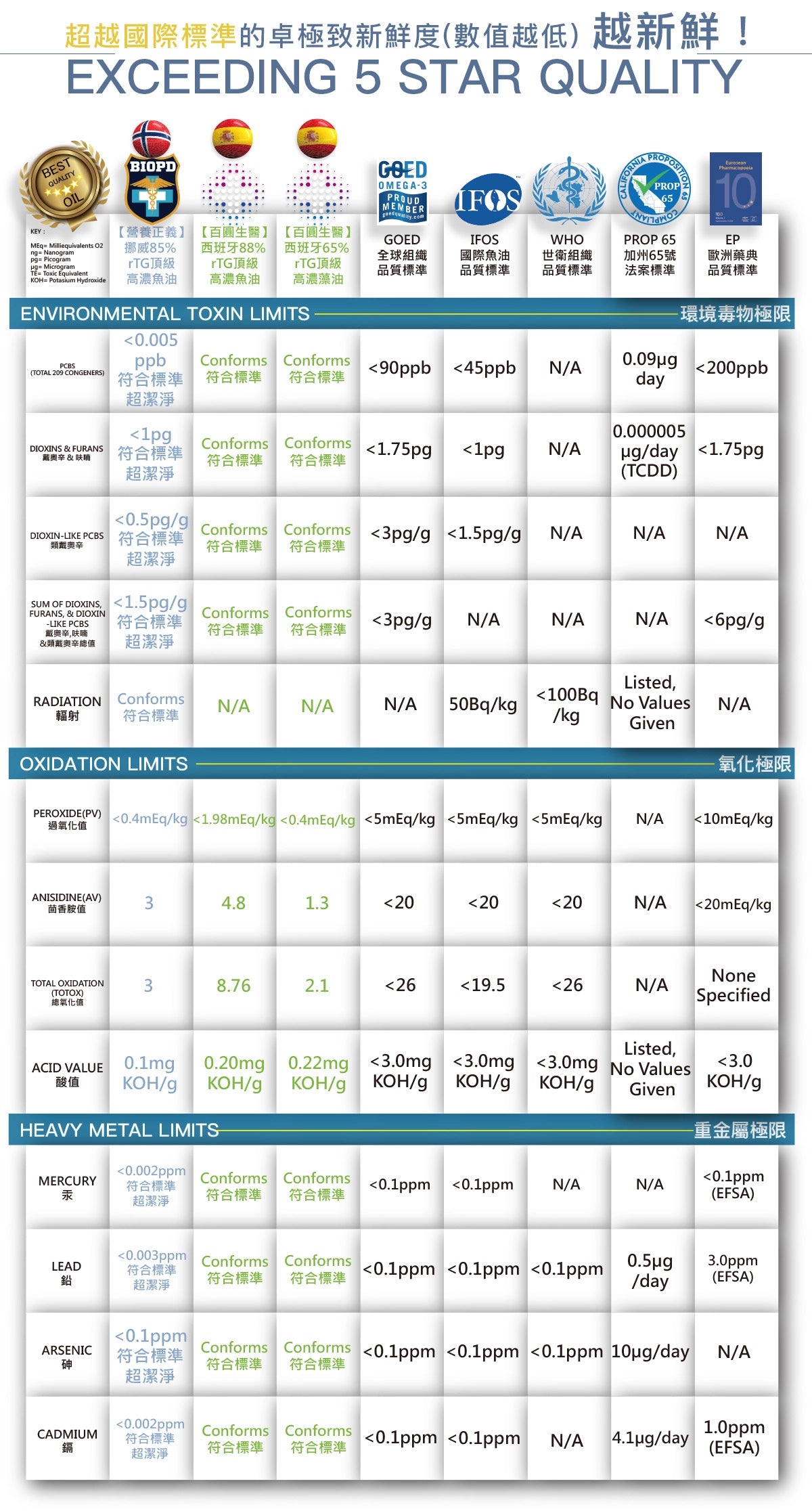 魚油型態的吸收度排名為:rTG > EE > TG ,因此建議選擇rTG型態的魚油,並且Omega 3 的濃度需大於85%,EPA+DHA 的總和濃度須高於80%,符合這樣規格的魚油才達較為有效的保健效果!