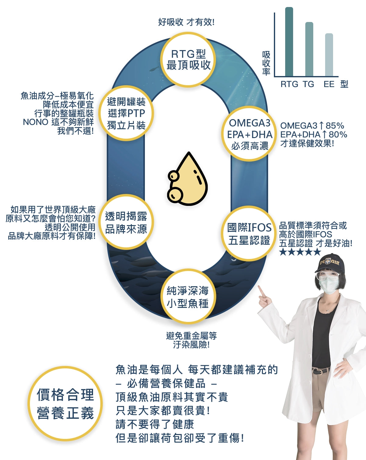 魚油型態的吸收度排名為:rTG > EE > TG ,因此建議選擇rTG型態的魚油,並且Omega 3 的濃度需大於85%,EPA+DHA 的總和濃度須高於80%,符合這樣規格的魚油才達較為有效的保健效果!