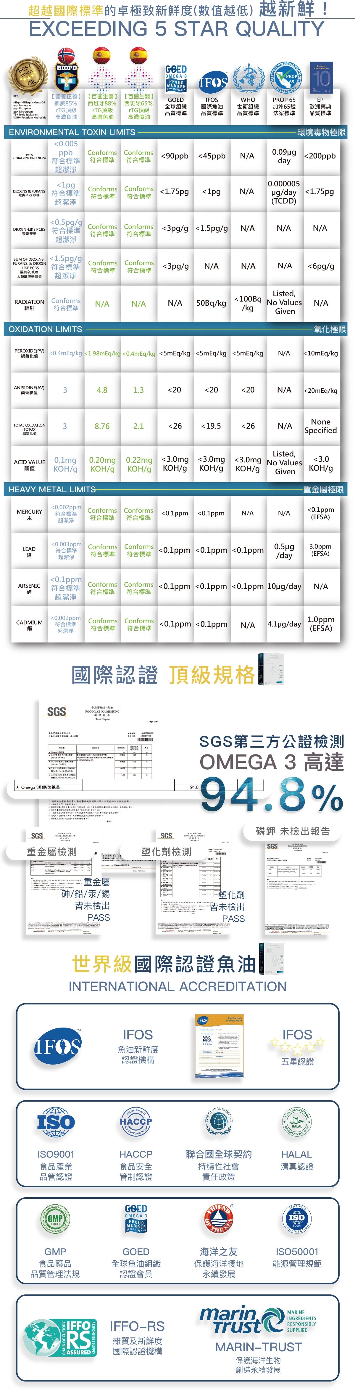 就讓全球最大供應廠VivoMega的頂規魚油,輔以第三方公證單位的標準 包含:SGS 全球檢驗科技、 EPS 歐洲藥典標準、IFOS 國際魚油品質標準協會標準、WHO 世界衛生組織標準 與全球 EPA 暨 DHA 組織 GOED 標準,以超越各項國際單位頂尖標準的-科學數據,來佐證我們又實現了【營養正義】!
